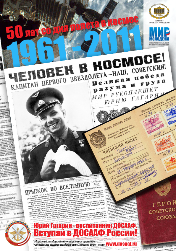 Всероссийская акция, посвященная 50-летию полета Юрия Гагарина в Космос проводилась Фондом «Мир молодёжи» совместно с общероссийской общественно-государственной организацией «ДОСААФ России».
